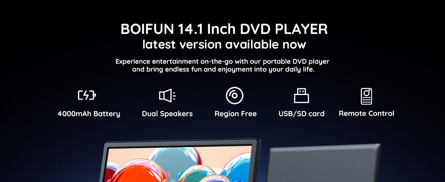 - SCREEN QUALITY: With advanced screen tech, the 14.1" swivel screen of BOIFUN DVD player shines brighter and clearer than its predecessors. Enjoy clarity and vividness with its 1366*768 resolution